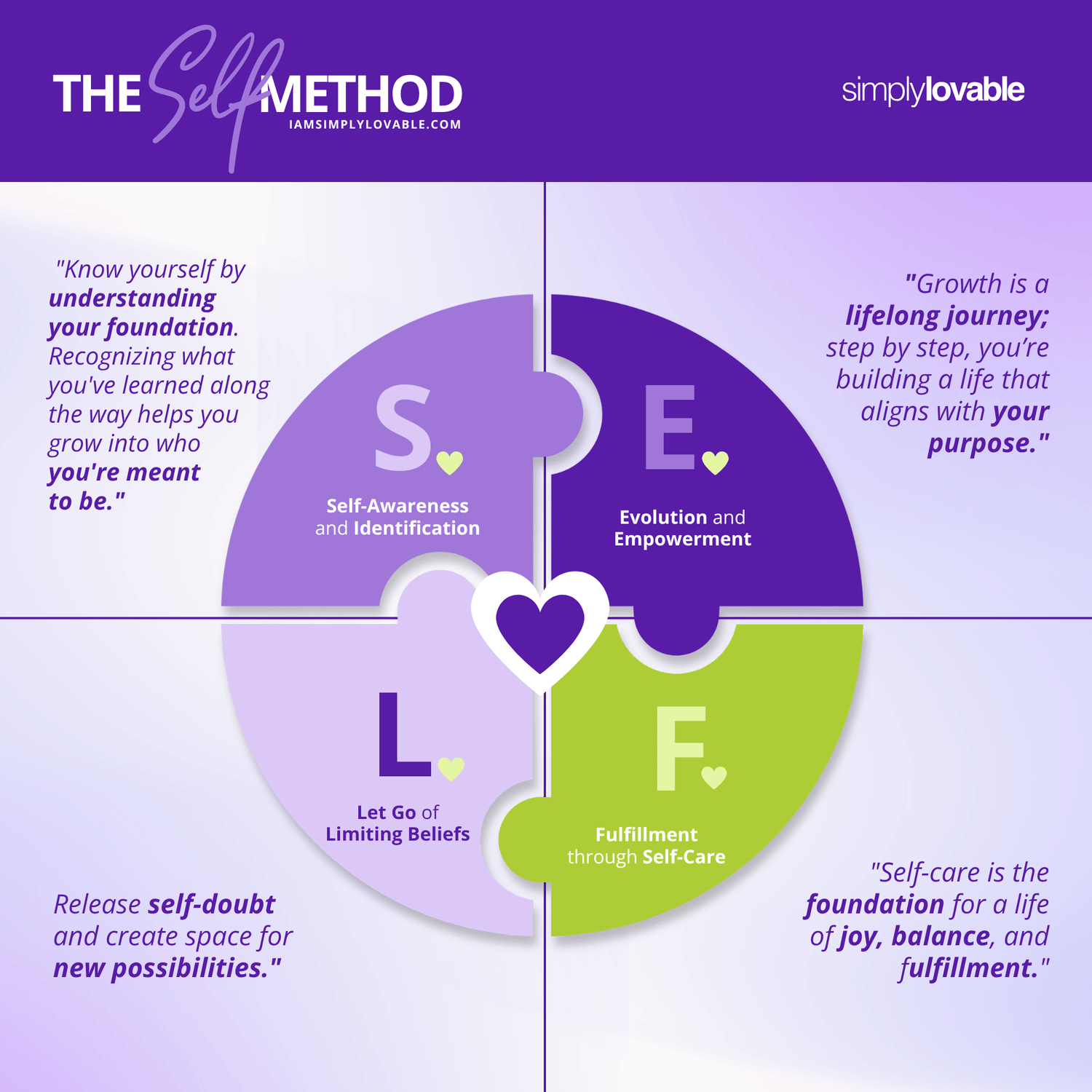 Simply Lovable® is built on the SELF Method™, a framework I created to help women understand themselves better and break the patterns that have kept them stuck.
