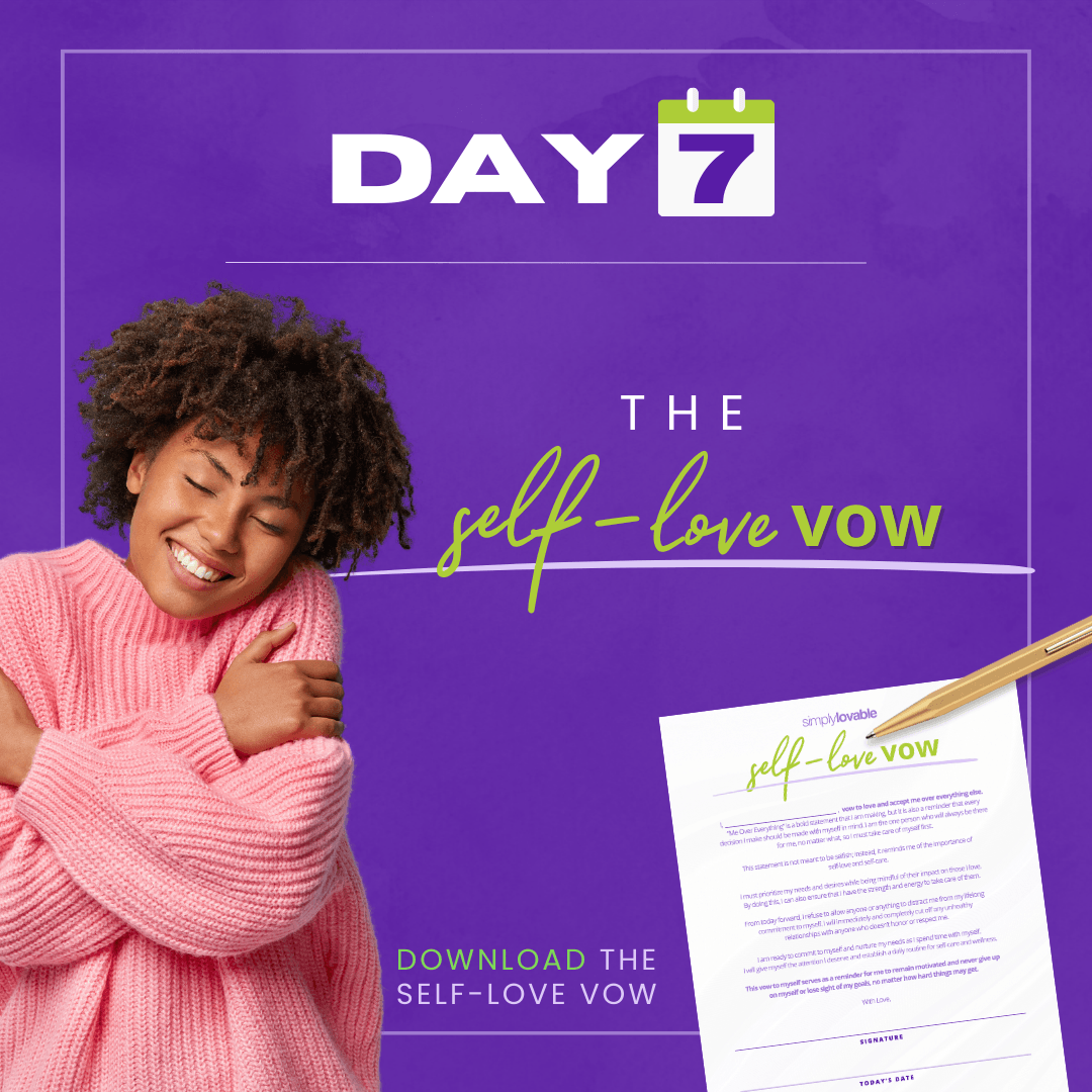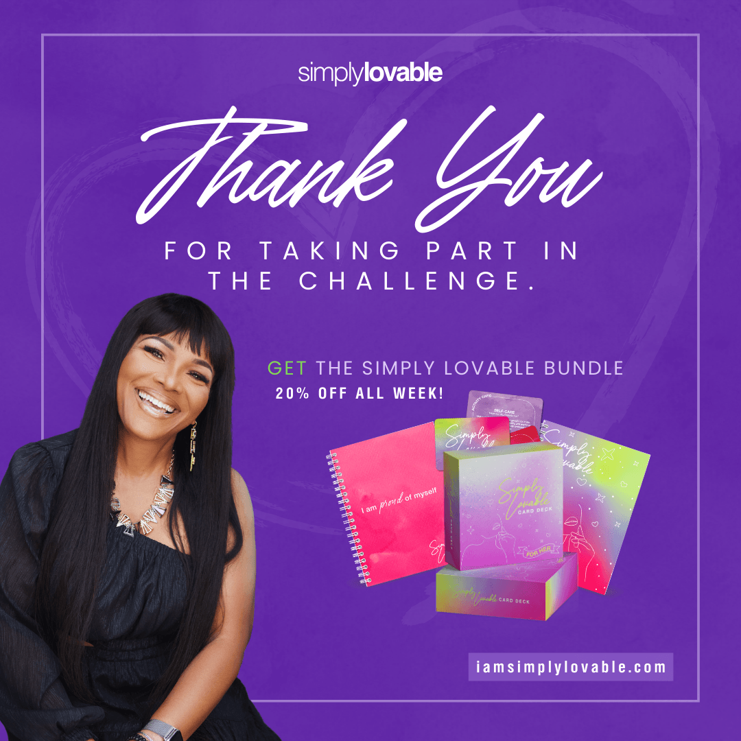 Over on IG and Facebook, we'll guide you through each day of the challenge. Remember to follow @iamsimplylovable to get all the updates and inspiration. It's your go-to spot for everything you need to fully engage in this self-love experience. Plus, links to all the resources you'll need for each day's activities will be available right below, ensuring you have everything you need to fully engage in this transformative experience.